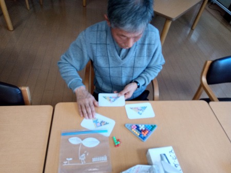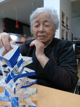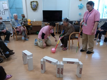 スタッフと積み上げゲームをするM様。