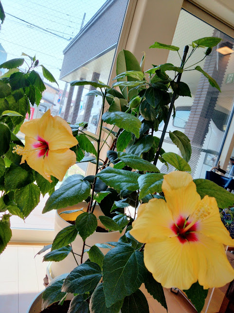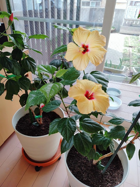 黄色のハイビスカスが2つ咲き、