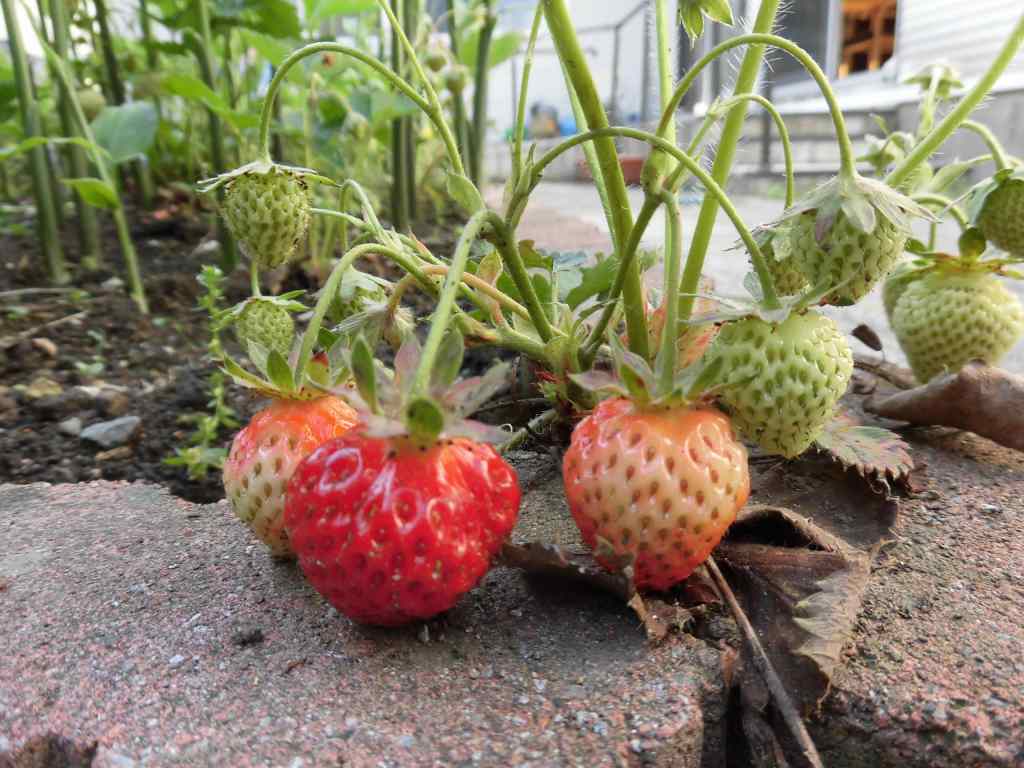 イチゴに実がつき、赤くなり始めました。