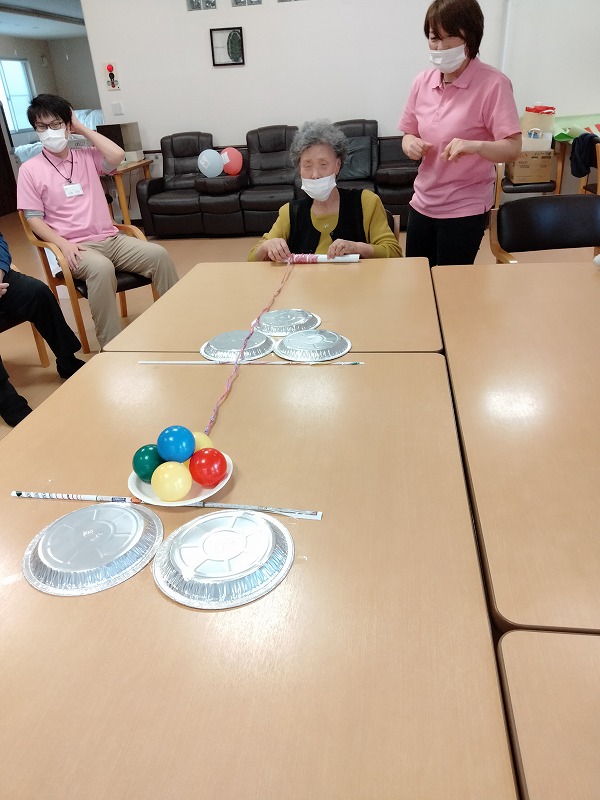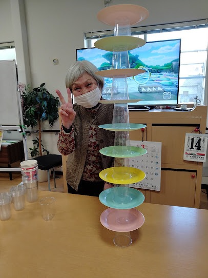今日のレクリエーションは、コップとお皿を使って