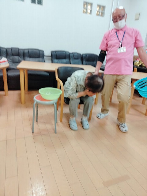午後の活動は、棒を使い紙コップをカゴに入れる