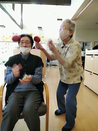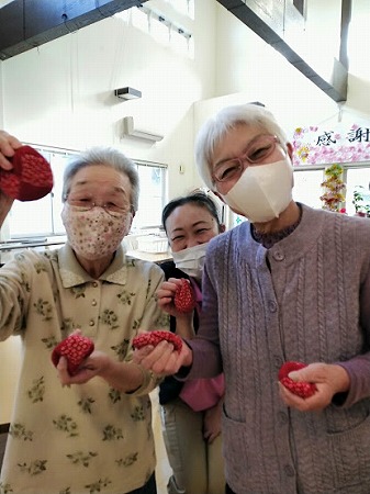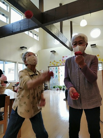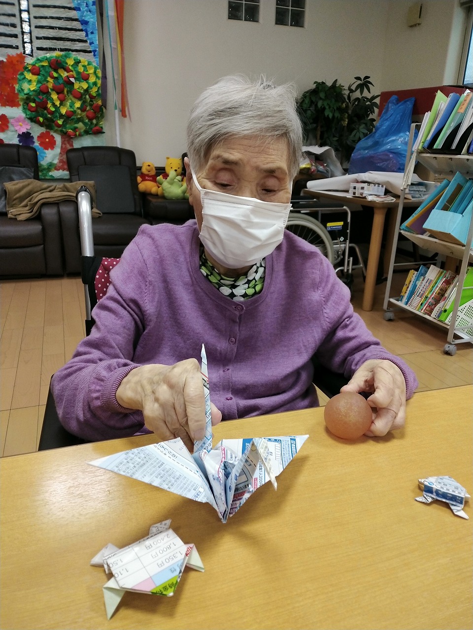 今日は、スタッフが作ったカエルを手に