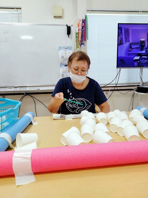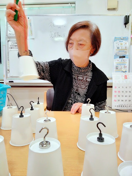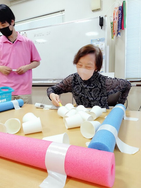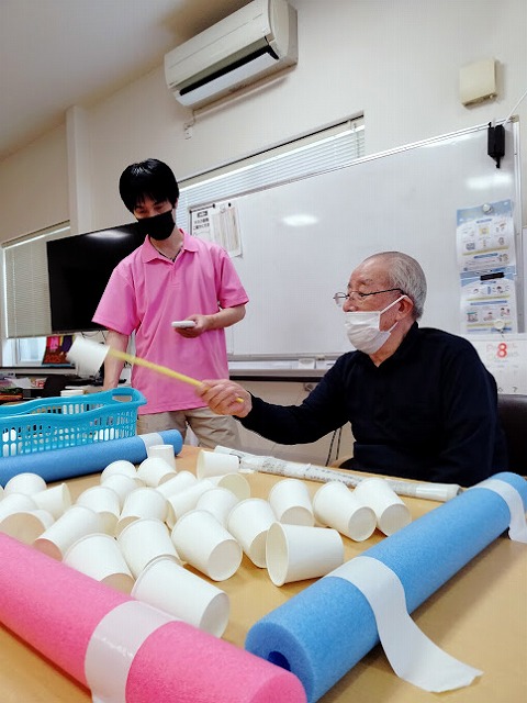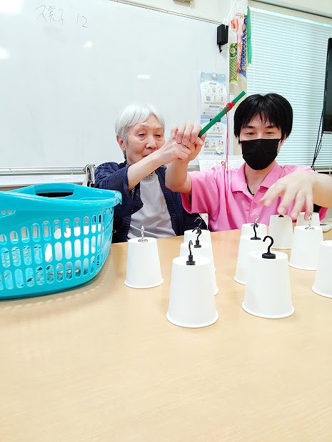 本日のレクリエーションは棒を使い紙コップを