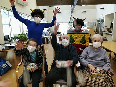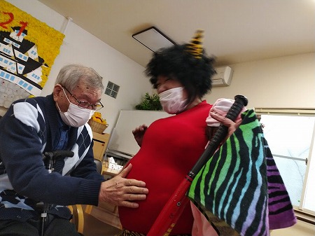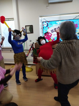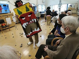 「鬼は外!鬼は外!」と立ち上がり鬼退治